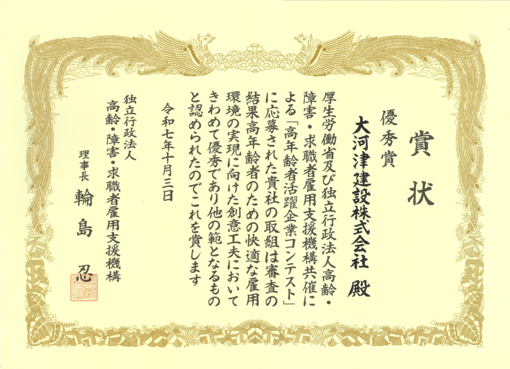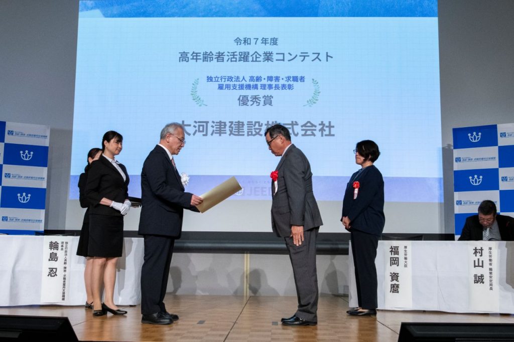 2025年10月31日 / 最終更新日時 : 2025年10月31日 ookoudu ■新着情報 令和7年度 高年齢者活躍企業コンテスト このたび、令和7年度 高年齢者活躍企業コンテストにて「独立行政法人 高齢・障害・求職者雇用支援機構理事長表彰」の【優秀賞】をいただきました👏✨ 東京で行われた表彰式には当社から2名が登壇し、表彰していただきました! これまで、高年齢の方々が“安心していきいきと働ける職場づくり”に取り組んできたことを評価していただきとても嬉しく思います😊🌈 これからも、年齢にとらわれず誰もが自分らしく活躍できる職場を目指して歩みを続けてまいります🔥🔥🔥