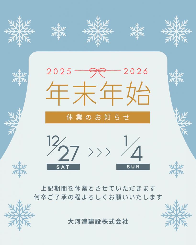 2025年12月22日 / 最終更新日時 : 2026年1月7日 ookoudu ■投稿 🎍年末年始休業のお知らせ🎍 年末年始のお知らせです。 誠に勝手ながら、12月27日(土)~1月4日(日)まで休業させていただきます。 2026年の営業は、1月5日(月)~となります。 ご不便・ご迷惑をおかけしますがよろしくお願いいたします。 寝正月にならないように感染症には十分注意をして過ごしましょう😷🔥